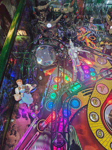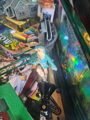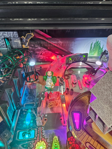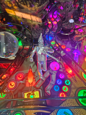 Each piece has been hand painted, modified and detailed to ensure proper fit in the playfield without obstructing the ball. Custom brackets have been created to allow these characters to fit just right, while maintaining clearances. The placement of these are situated with the corresponding artwork on the playfield. A few unique features are: the Tinman appears as he is floating between the two wire forms; the Scarecrow looks like he is jumping over the ball as it enters the right ramp; the right out lane drains under Toto; the spotlight behind the Wizard shines perfectly on the Lion, Mayor and/or Coroner.