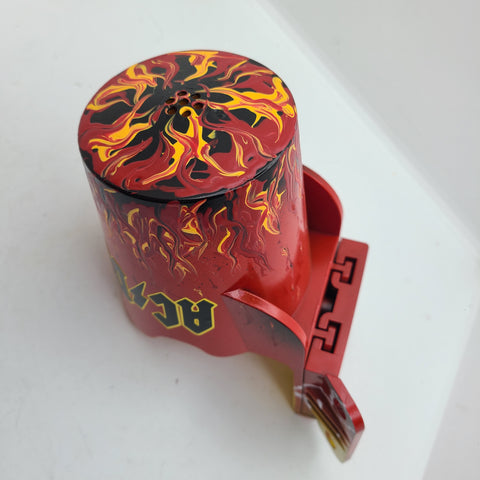 These PinCups have been custom painted to enhance the color scheme of your pinball machine.  Each PinCup is hand painted using various colors that are present on the exterior of the cabinet.  This one has been done in a fire look to match the games theme by blending paints of black and red  to achieve this look.   Clear coated at the end to ensure durability.
