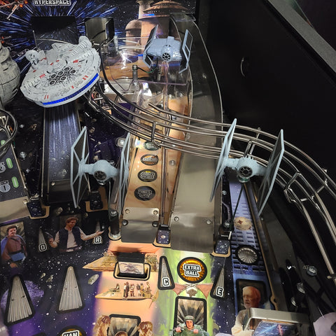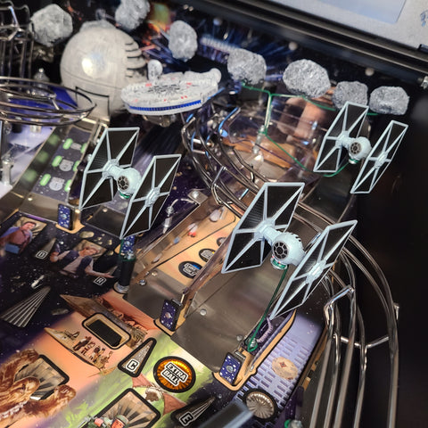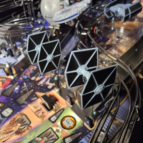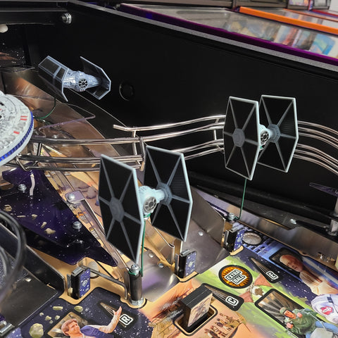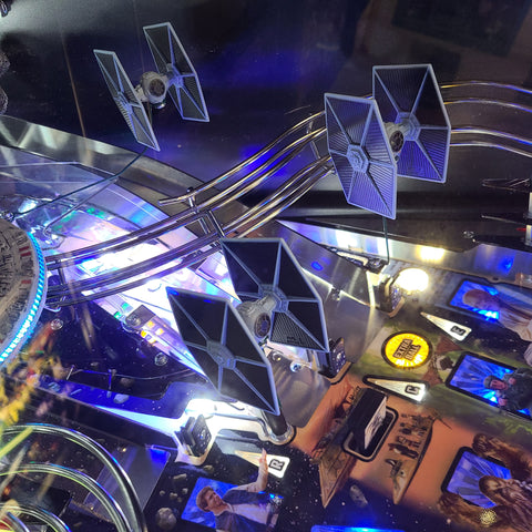 The new Star Wars pinball is an exciting fast flowing game by Steve Ritchie.  Bring some more excitement into your game with these stylish Tie Fighters.   Battle the X wings and defend the Death Star.  These Tie fighters look great in a group at the back of the machine.  The formation blends in well with the backboard artwork due to the size and scale of them.   Comes with a custom wire form bracket  and can be re positioned at a fighting  angle.  They are a little smaller that the factory Tie fighter and look great in the back making them look farther away.  The size and scale blend just right. Get a set of 3 fighters and save!