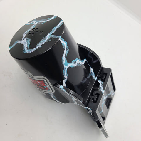 These PinCups have been custom painted to enhance the color scheme of your pinball machine. Each PinCup is hand painted using various colors that are present on the exterior of the cabinet. This one has been done in a fire look to match the games theme by blending paints of black, red and yellow to achieve this look. Clear coated at the end to ensure durability.