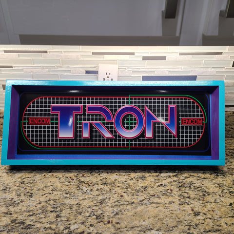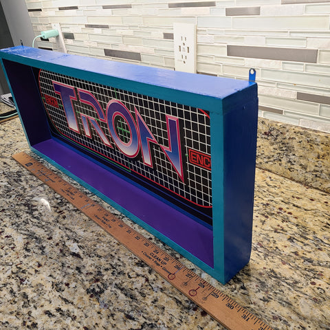 ...These classic arcade game marquees look great in any gameroom. Measuring approximately 24 inches wide and varies from 6 to 10 inches tall depending on the title. Each art piece is hand crafted and framed with a 4 inch wide pine wood frame. The interior trim is a square stock 1/2 inch interior perimeter frame painted in a accent color. The paint used accent the artwork and colors of the marquees. These pieces can be ordered with and without led backlighting. Choose either standard white leds or color changing leds with multiple lighting effects . The older original vintage marquees may have light scratches or small blemishes showing their age. Some titles can be ordered brand new and cost more than the vintage one's. These are all priced based on current condition and rarity. Limited availability on some titles.