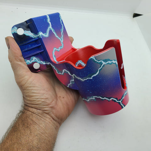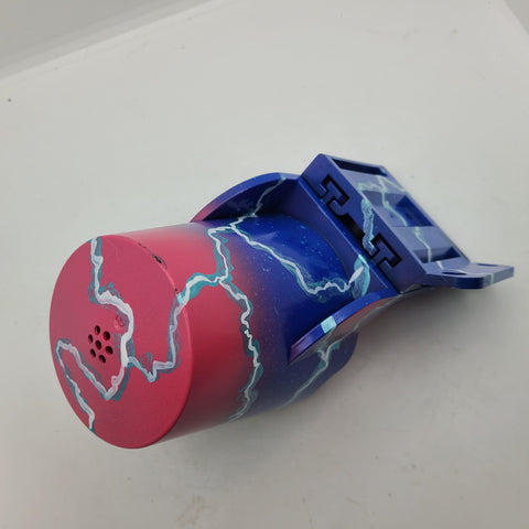 This "Starlord " PinCup has been custom painted to enhance the color scheme of your pinball machine. This has a purple inside, the outside has a fade of light blue , blue and purple. A corresponding decal logo is added for that custom look. Each one is hand painted using various colors that are present on the exterior of the cabinet. These colors are blended to give a unique look for each one. They are clear coated at the end to ensure durability.